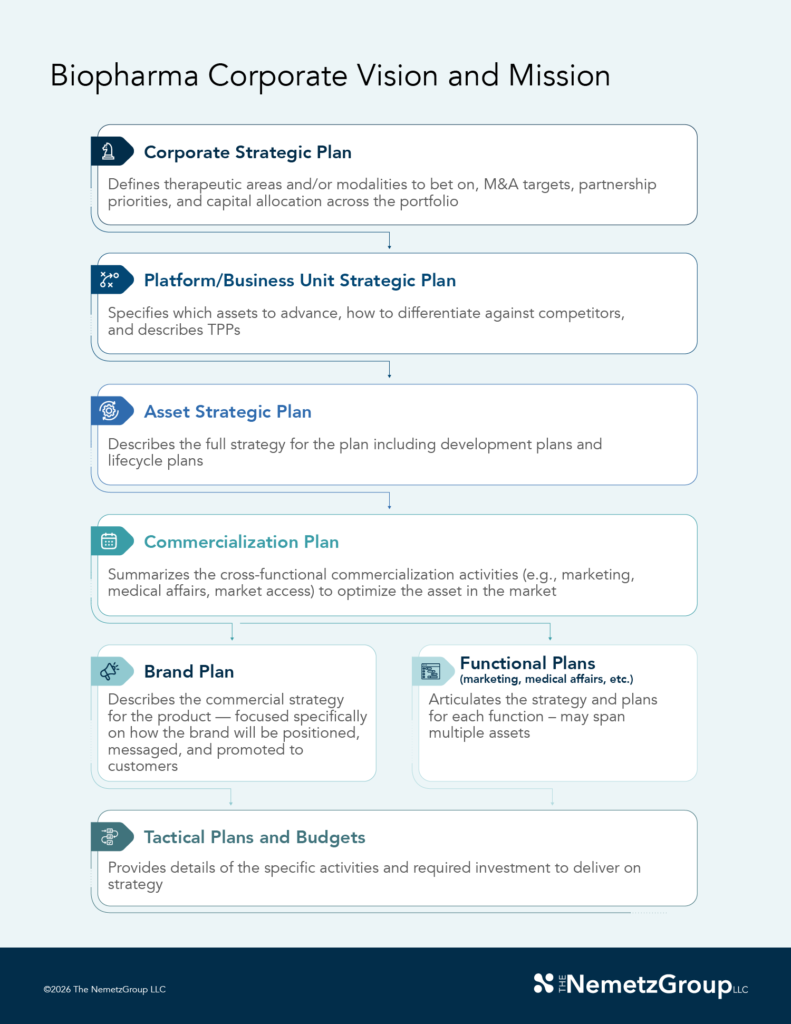 Strategic planning within a company must be interconnected, with a clear hierarchy that aligns every effort with the overarching vision and mission. As plans cascade down the organization, they increase in specificity from corporate-level decisions on therapeutic areas and platforms to asset-level, tactical execution.
